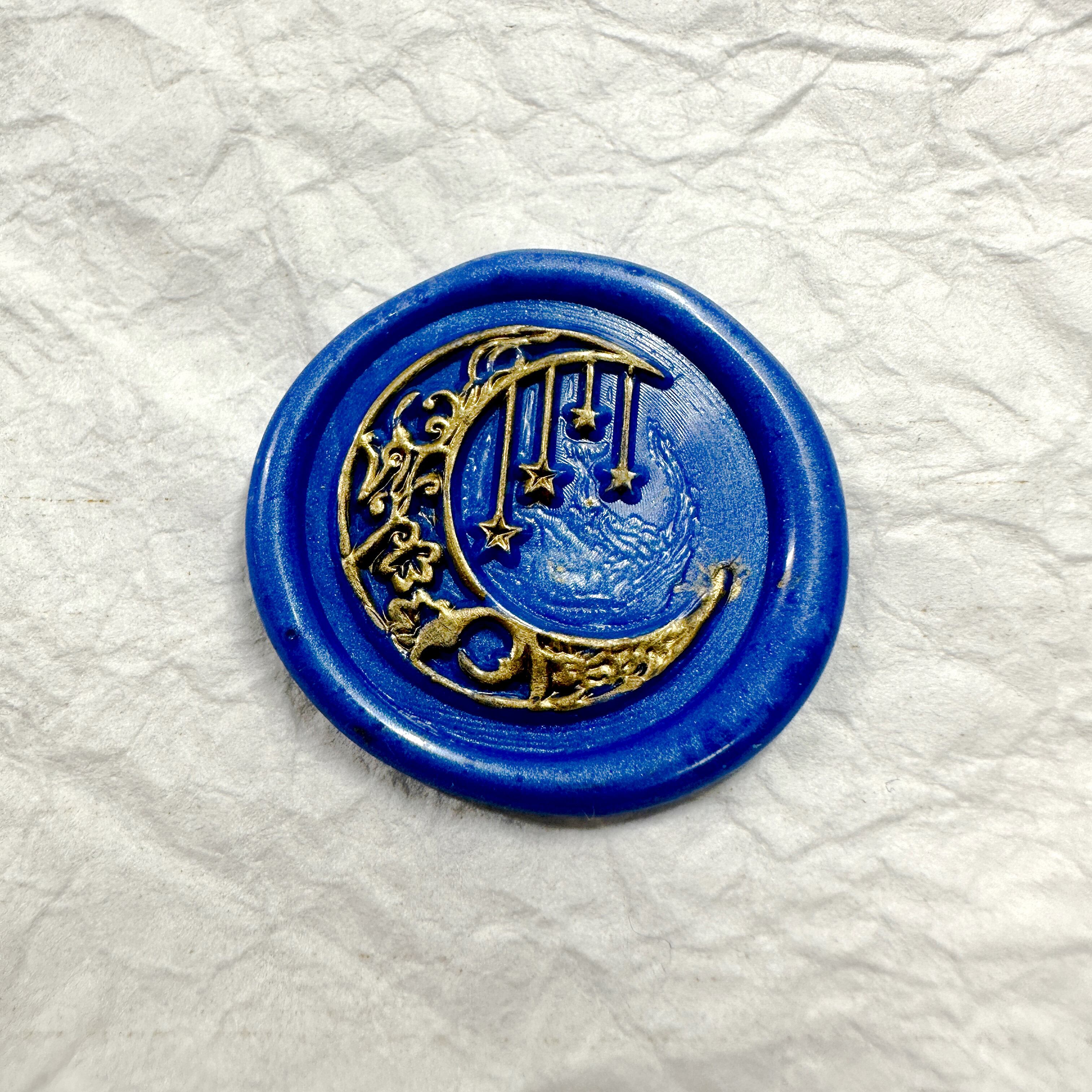 青系の混色で25mmの円形シーリングスタンプシールに、月から星が下がっている柄の10枚セットです。