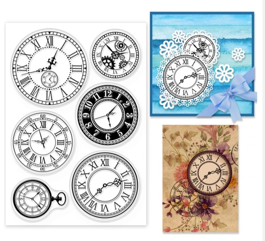 クリアスタンプとは、透明なシートに模様が刻印されたもの。アクリルブロックにスタンプをのせ、インクを塗って押すことでイラストをプリントすることができます。ヴィンテージクロックのクリアスタンプは、そのまま使えるので、また新しいアクリルブロックを買い足す必要もありません。