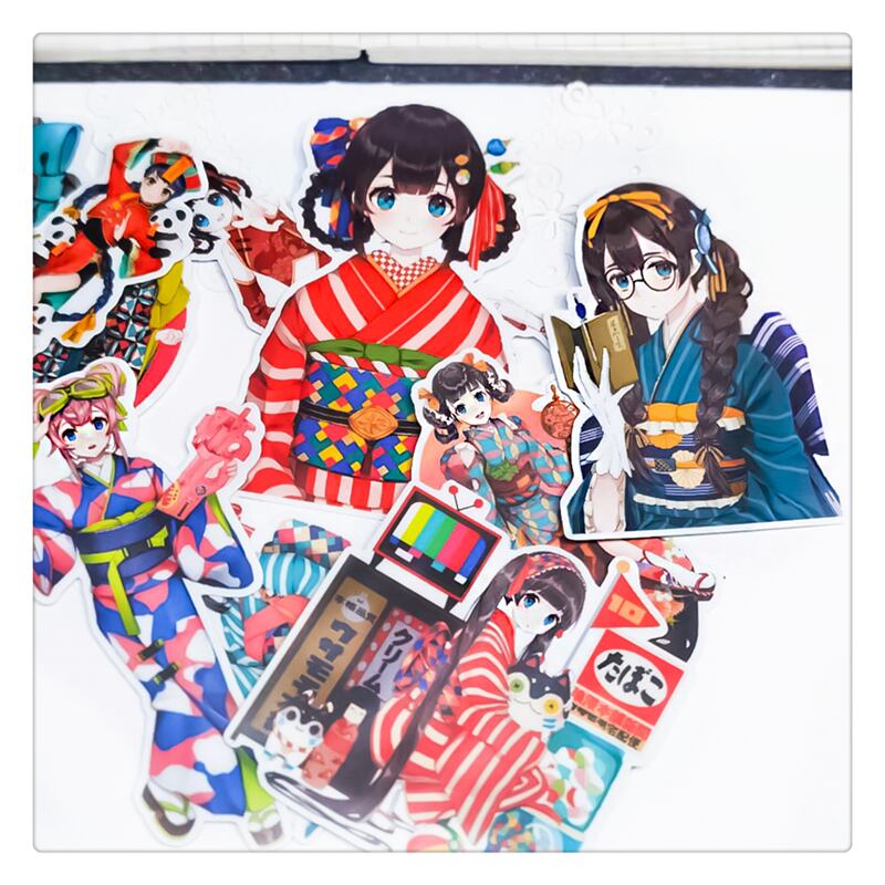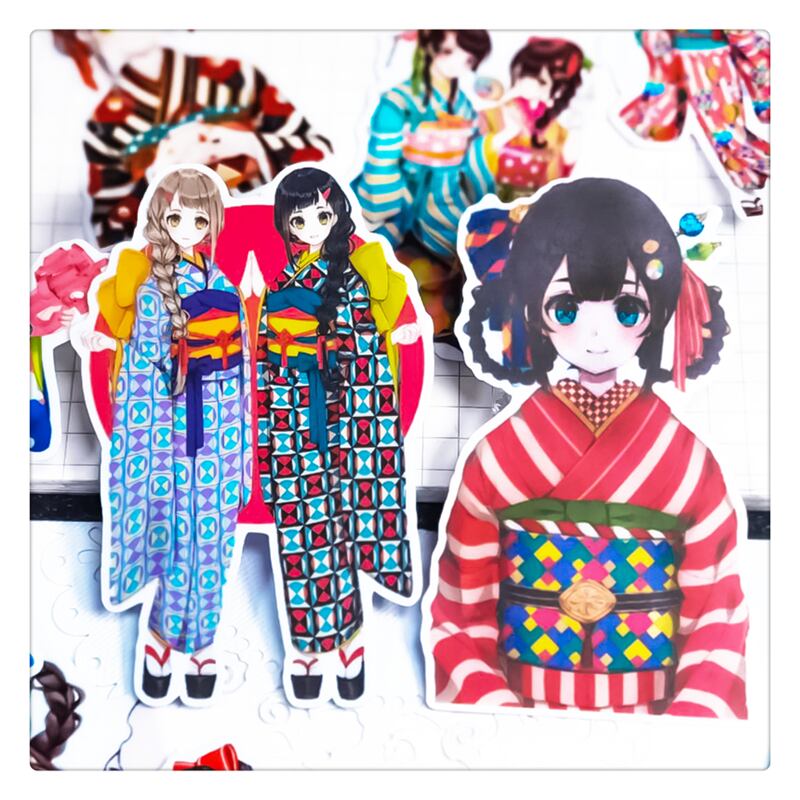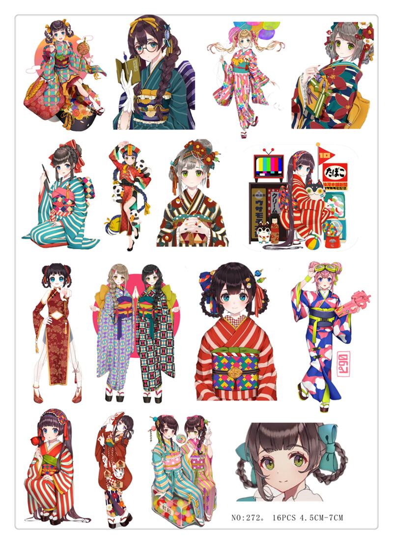 日本風着物女子のステッカー16枚セット。