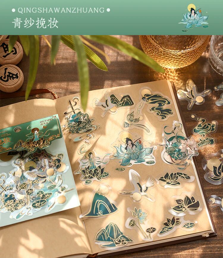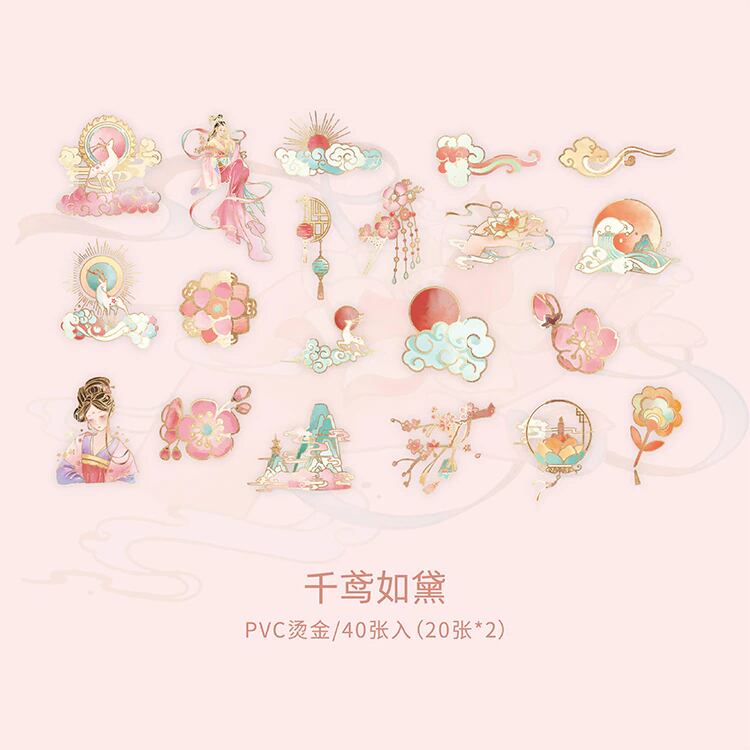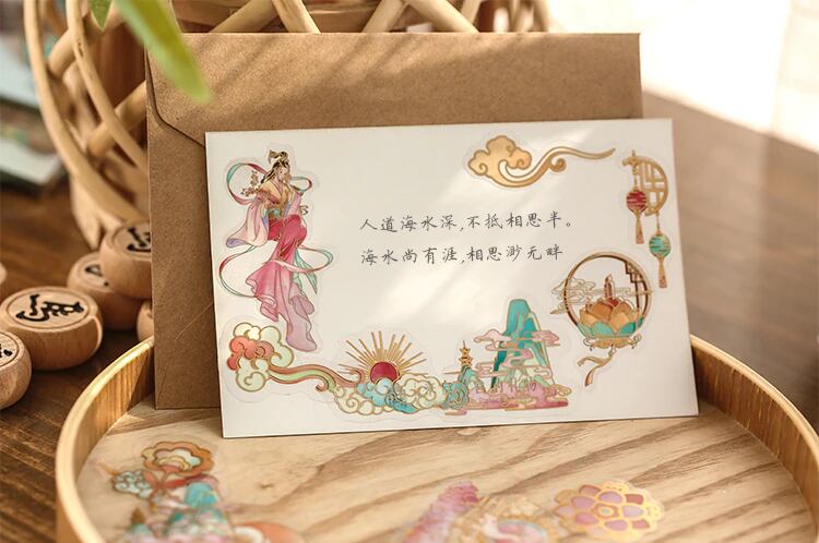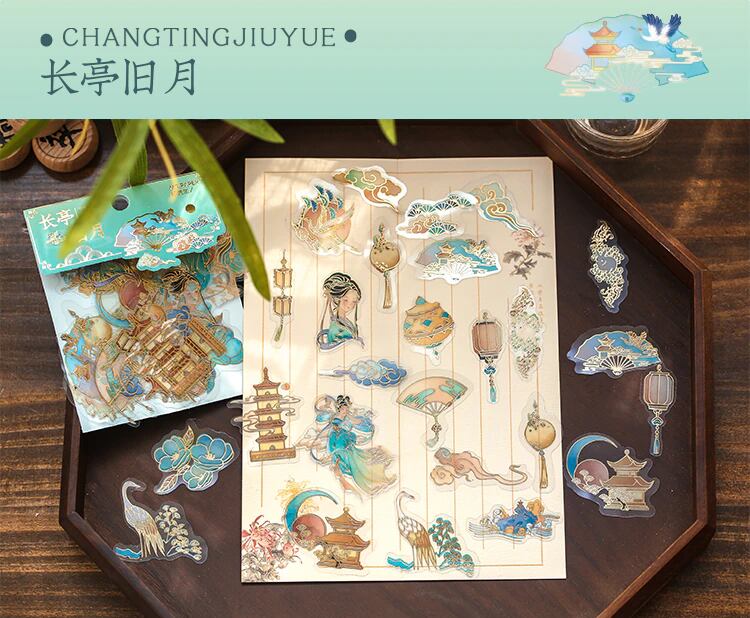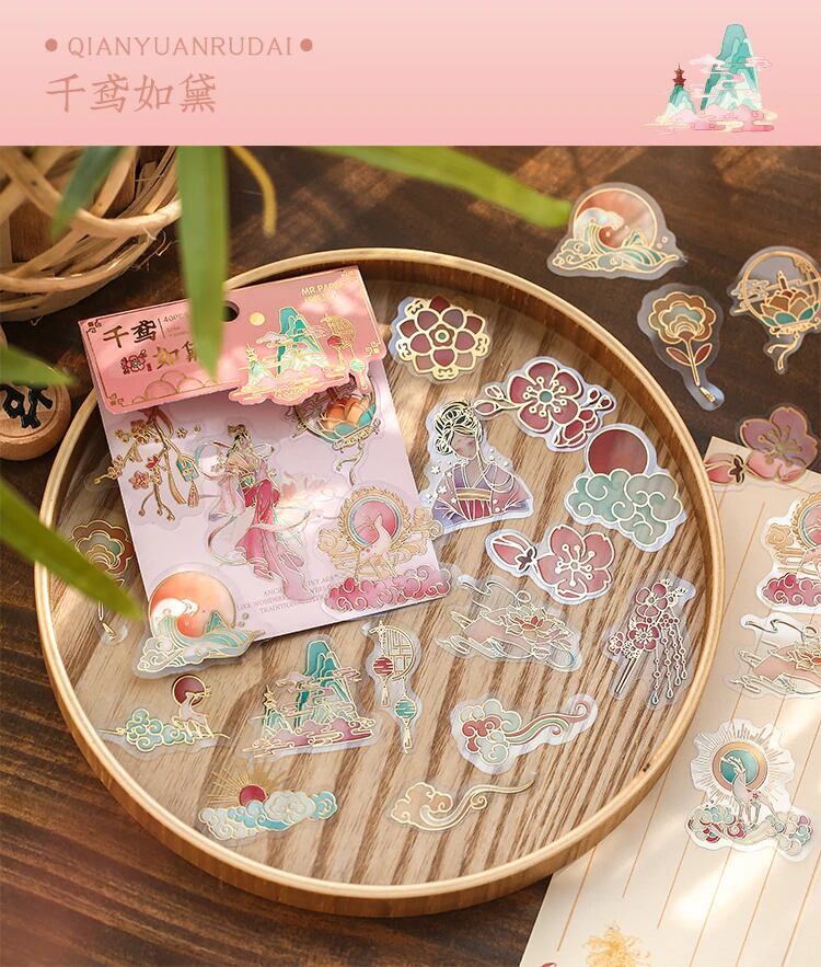 半夢琉璃シリーズの40枚入りのこのステッカーセットは、中世中国風の物語に出てきそうな雰囲気のさまざまなデザインが揃っています。