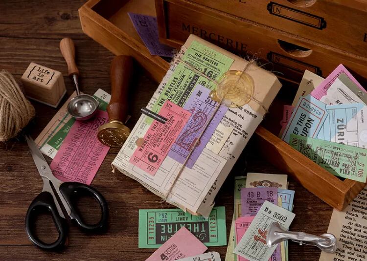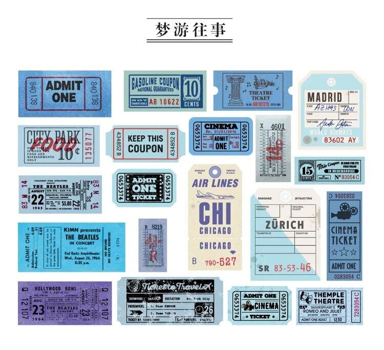 Vintage Ticket Sticker Pack は日記やアルバム、手紙や贈り物の装飾などに使えます。